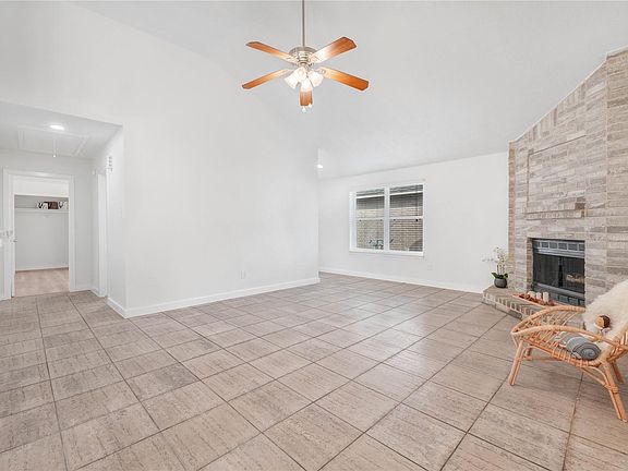 Welcome to this fully renovated 3-bedroom, 2-bath home nestled on a quiet cul-de-sac. Featuring an open floor plan with high vaulted ceilings centered around a beautiful brick fireplace, this home offers both comfort and style. Enjoy durable tile and LVP flooring throughout—no carpet! Energy-efficient double-pane windows, a 2022 roof, and a 2022 HVAC system ensure peace of mind and lower utility costs. The bright kitchen flows seamlessly into the living and dining areas, ideal for entertaining. A spacious utility room provides excellent storage. Move-in ready and thoughtfully updated, this home is the perfect blend of modern design and everyday functionality.