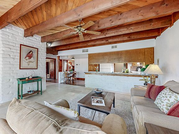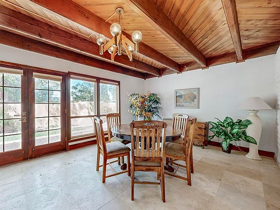 Make this North Valley charmer your own! This true, one-story 3 bedroom , 2 full bath ,1937 sf Pueblo style home on .18 acre lot just off Rio Grande Blvd has adobe accents, travertine, brick and carpet flooring, wood ceilings with large beams in most rooms, two cozy fireplaces including a kiva in the primary bedroom plus refrigerated air conditioning and CFA heat. The kitchen with granite counter tops opens to the living and dining/family rooms. Two sets of French doors give easy access to the private backyard with mature trees, grass, roses and grapevines. New stucco applied on whole house and exterior trim re- painted in summer 2024. Conveniently located near valley restaurants & walking trails. Don't miss this one!
