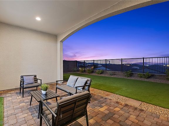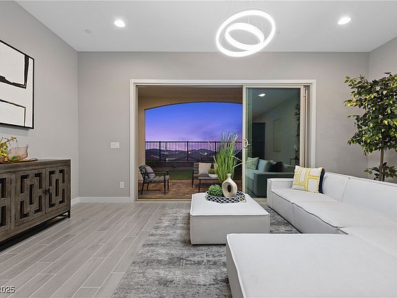Nestled in a gated community across from Explorer Park, this stunning single-story residence, built in 2022, offers 1,800 sq. ft. of modern living with breathtaking Strip and city views. Step through the gated courtyard entry into a thoughtfully designed open floor plan featuring 3 bedrooms and 3 bathrooms. The chef’s kitchen impresses with sleek dark cabinetry, a striking white quartz island, and SS appliances. Sliding doors open to the backyard, creating the ultimate space for indoor-outdoor entertaining. The serene primary suite is highlighted by a modern chandelier, spa-inspired bathroom with a super shower, dual sinks, and a large walk-in closet. Outside, enjoy alfresco dining under the covered patio while overlooking an open turf area. At night, unwind while watching the iconic Las Vegas Strip lights come to life. Additional upgrades include window coverings throughout, water conditioner, RO system, and epoxy garage floors. Minutes from upcoming Urban Core and Downtown Summerlin.