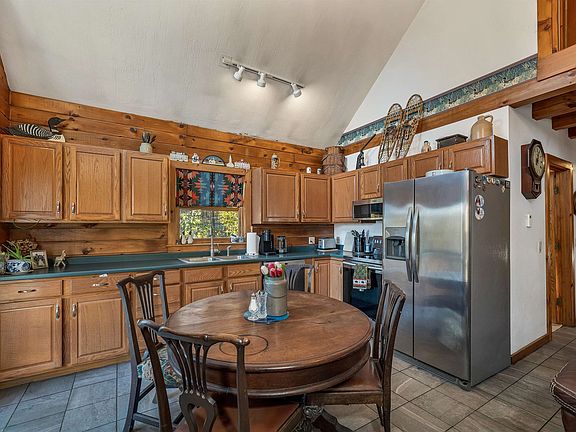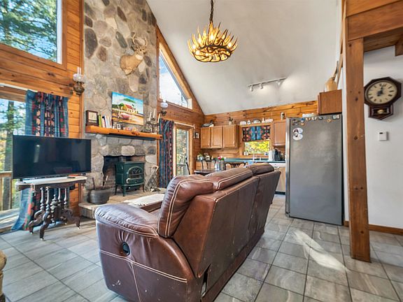 Dramatic fieldstone fireplacePrivate acresPristine gunnison lakeWalk-out basementDirect lake accessSoaring cathedral ceilingsGenerous wraparound porch