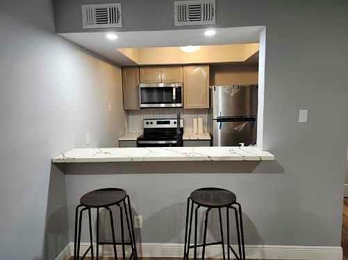 Cozy cottage style condo with many upgrades. New kitchen w/ beautiful stone countertops and stainless steel appliances. Both bedrooms have its own bathroom. New A/C units. No carpet. Great starter home. Agent/Owned property.