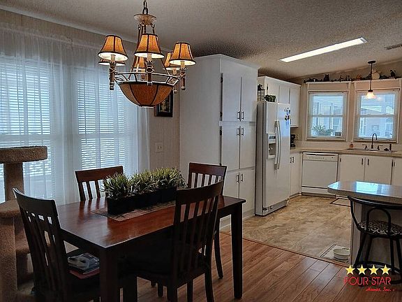 Do NOT miss out on this well-maintained 2/2 with large relaxing screened lanai, ample shed, carport for two cars, as well as a backyard garden area. Easy to keep cool in summer and cozy in winter with double-pane windows, laminate wood flooring, updated HVAC, vapor barrier, and tiedowns replacement all done in 2020. Lot rent for 2024 is approximately $710.00. Kings Lake welcomes 2 approved pets and offers a myriad of activities, a heated pool, and a spa located at the gorgeous clubhouse. Enjoy the Florida Lifestyle. Call for your tour today!