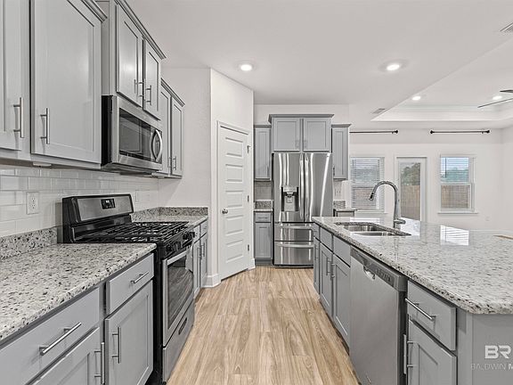Welcome to the spacious and inviting 4-bedroom, 2-bath Isabella floor plan, offering 1,948 square feet of thoughtfully designed living space. This open-concept layout features a beautifully appointed kitchen that flows seamlessly into the great room—perfect for both everyday living and entertaining. Interior highlights include: Luxury vinyl plank flooring in the main living areas, Granite countertops in the kitchen and bathrooms, Custom-painted soft-close cabinets, Stainless steel appliances including microwave, range, and dishwasher. Step outside to enjoy your large, covered back porch—ideal for relaxing or entertaining. This home features a custom built pergola in the back yard. The coastal-style exterior showcases 4-sided Hardie board siding with board and batten accents and charming painted shutters. This home is being built to Gold FORTIFIED Home™ standards. The Aventura neighborhood is located in Gulf Shores, offers incredible community amenities including: A resort-style pool and BBQ grilling areaA resort-style pool and BBQ grilling area, Dog park, Playgrounds, Shuffleboard area, Pavilions and sidewalks throughout. Just minutes from the Gulf of America's white-sandy beaches, shopping, dining, and entertainment, this is a great place to call home. Buyer to verify all information during due diligence.