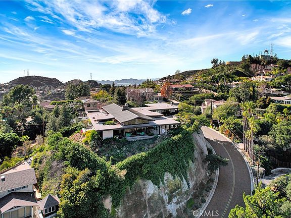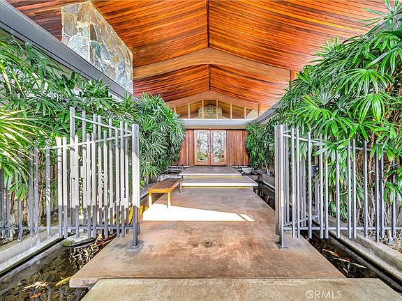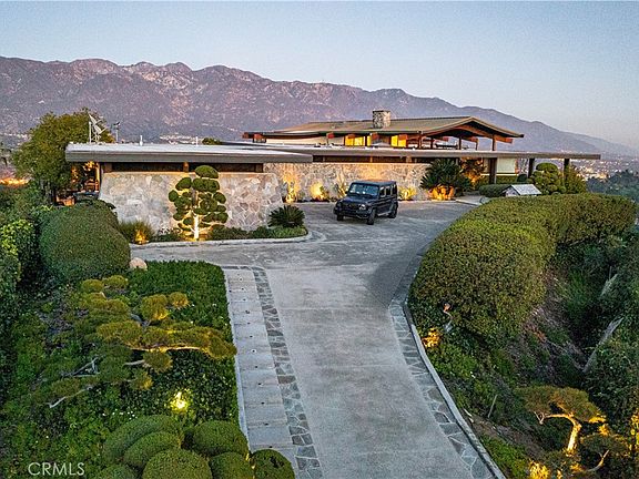 This spectacular mid-century modern masterpiece, built in 1966 by renowned architect Jack Simison with Frank Lloyd Wright influences, was exquisitely remodeled in 2013. The open floor plan, adorned with original terrazzo flooring, flows seamlessly from the interior to the exterior patio. Perched on a ridge, it offers breathtaking 270-degree views of the San Gabriel Mountains and JPL (NASA Jet Propulsion Laboratory). The unique roof design and bonsai-like trees create a striking East-meets-West aesthetic. The gated entry ensures privacy, leading to a stunning hexagonal pool, koi ponds, and Craftsman-style stained glass doors by Judson Studios. The property exudes a Zen ambiance, epitomizing the indoor-outdoor California lifestyle with curated landscaping and lighting. Inside, soaring redwood cathedral ceilings, expansive glass walls, and multiple entertainment spaces offer a private oasis. The front exterior features Pennsylvania blue Bouquet Canyon stone, guiding you to a dramatic fireplace that enhances the home's organic, Arts and Crafts-inspired design, fusing rock, stone, concrete, and wood for a perfect blend of East and West influences.