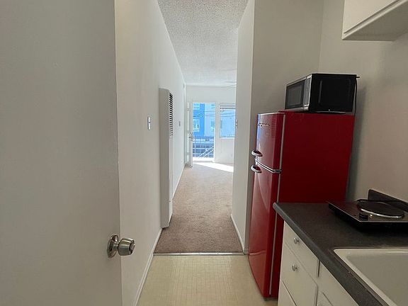 Don't miss out on the opportunity to reside in this spacious upper studio unit with 1 bathroom. The unit provides a generous living arrangement complemented by carpeting throughout, with tile flooring in the kitchen and bathroom. It also features blinds and fresh paint for a clean and presentable appearance. The kitchen is fully equipped with tile countertops, white cabinetry, and appliances, including a refrigerator, microwave & hotplate. Ample closet space is available in the unit, ensuring sufficient storage capacity. For added convenience, there is a common laundry facility onsite. Street Parking Only.