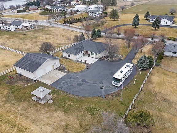 Beautiful custom built home situated on a private acre! Recently updated kitchen offers skip sawn hard wood floors, stainless steel appliances, pantry, new custom cabinetry, granite counter tops and tile back splash. The main floor family room features LVP flooring, vaulted ceilings, gas fireplace and a french doors to the large covered deck with retractable awning. The lower level has a wet bar, pellett stove, large family room with a slider to a covered patio, 2 bedrooms and a full bathroom. This amazing property sits on a parklike setting which is fully fenced and has gated access. Large 23X40 shop, paved area to turn around a 40 foot RV, fruit trees, garden area and large mature trees for privacy.