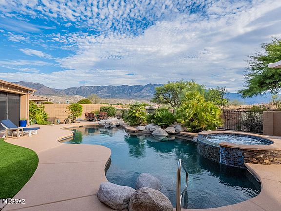 Fabulous retreat in SaddleBrooke One - a unique entertainer's paradise! With 3,578 SF (per prior appraisal), this home offers 3 bedrooms (one used as an office), 2 full and 2 half baths. The chef's kitchen impresses with Sub-Zero fridge, Wolf cooktop and wall ovens, pot filler, warming drawer, ice maker, wine fridge, and large granite island with prep sink. Entertaining spaces abound--wet bar off the kitchen and family room, recreation room with fireplace, pool table, bar, and Arizona room access. The backyard is spectacular with mountain views, heated salt pool and spa, outdoor kitchen, fireplace, and citrus trees. The luxurious primary suite features its own fireplace, reading area, and spa-like steam shower. Owned solar for home and pool!