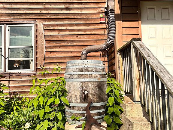 From the Tudor-inspired exterior to the rustic wood siding and thoughtful details like a rainwater collection barrel and a firewood shelter, every inch of this property is designed with care.