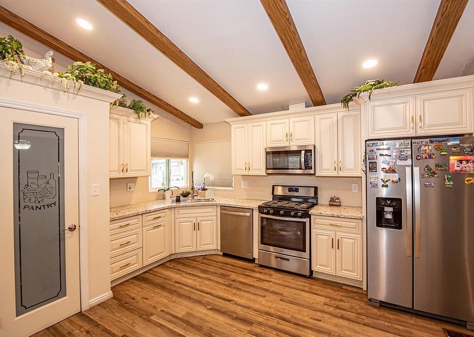 Welcome to one of the best lots in the sought-after Golf Knolls 55+ community! This home is set on a spacious corner lot and features a large 2-car garage plus dedicated RV parking—a rare find in this neighborhood. Inside, the home offers 3 bedrooms and 2 full bathrooms, with the third bedroom currently used as an office or den. The open concept, highlighted by high ceilings, exposed wood beams, LED recessed lighting, and elegant wood shutters that bring warmth and character to the space. Recent upgrades include: Fully remodeled kitchen and bathroom, new flooring in the kitchen and dining area, new pantry new roof, tankless water heater. The primary suite features a very large walk-in closet, and the oversized laundry room includes extra space—ideal for a utility sink or second fridge. Outdoors, enjoy a covered patio and a low-maintenance yard with enough space for your dog or a garden.