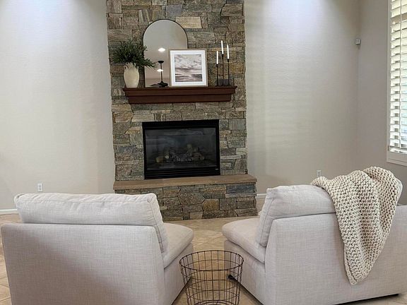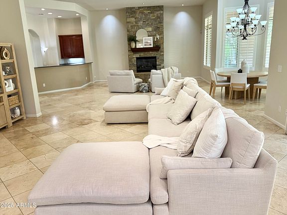 Beautifully designed single-level Venado model on a north/south facing lot next to a common area in Aviano. This split floor plan features travertine throughout, no carpet and a spacious great room open concept to the kitchen and dining area. The primary suite and office sit privately on one side, while the guest wing offers two en-suite bedrooms plus a fourth bedroom/bonus room. The home includes an extra large primary suite, with an expansive shower, plantation shutters, 4 car garage, bar area, full-length covered patio for outdoor living.