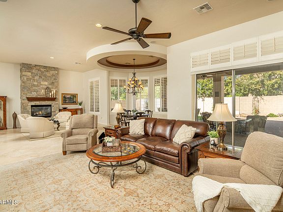 Stunning single-level home with exceptional curb appeal, ideally located next to a park in Aviano! Travertine flooring & plantation shutters throughout add elegance. A central foyer separates the spacious primary suite & office from the guest wing, which features two full ensuite baths and a versatile fourth bedroom/bonus room. Designed for both family living & entertaining, the chef's gourmet kitchen boasts granite counters, eat-in dining, and premium appliances. It opens to a vast Great Room with a gas fireplace, formal dining, and a full bar setup with seating & wine refrigerator-all overlooking the expansive covered patio & private backyard. This remarkable home offers access to Aviano's top-tier amenities and is minutes from Desert Ridge Marketplace, High Street, JW Marriott & more!