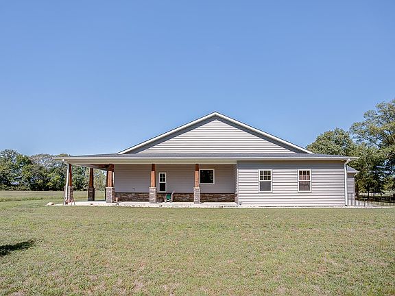 This custom home that sits on 11.9 +/- acres with a gorgeous covered wrap-around porch, three-car garage, a huge kitchen, and an open-concept floor plan is waiting for its new owner. The front door opens into the kitchen and living room. The kitchen features quartz counters, a gas cooktop, a pantry, a buffet island, and stainless steel appliances. Luxury vinyl plank covers the floors except in the bathrooms and laundry room. The large master bathroom has ample cabinetry for storage, two walk-in closets, a water closet, and a walk-in shower with 3 shower heads. The walk-out basement is unfinished with some framing done. There is a concrete vault in the basement with a locked keypad door. The 60x100 outbuilding has 3000 finished square feet. The finished side has a concrete floor, electric, heating and cooling, and a storage loft leading to the start of an office. The unfinished side has a gravel floor, electric, and hanging shelves for storage.