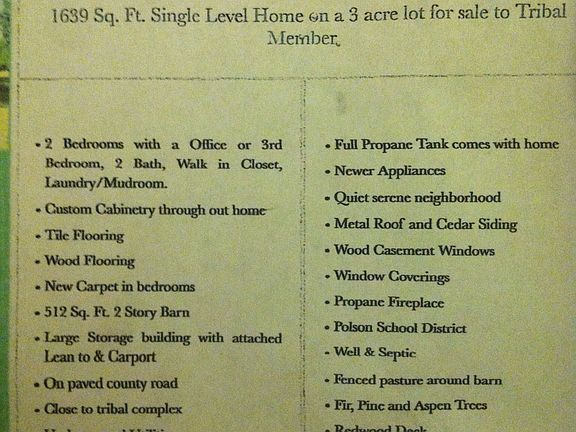 Tribal Lease. Must be CSKT member to purchase. Well built 3 bedroom, 2 bath home on 2 acrers. Open floor plan, den/study room, decorative stone propane fireplace, custon kitchen cabinets. Large metal building, deck and patio. Mature Pine trees, quiet private setrting. Mountain view and small barn. septic and well. Call listing agent for more details.