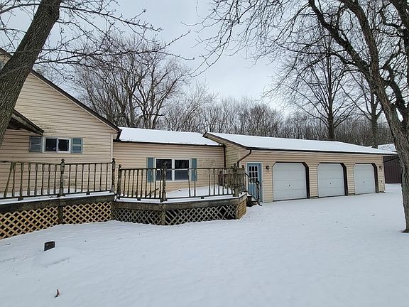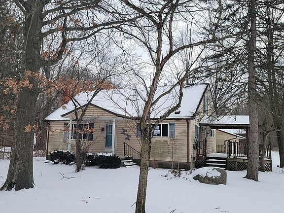 This spacious vinyl-sided Cape offers a versatile layout on a deep 1.85-acre lot with excellent indoor and outdoor features. The home includes a side deck and side porch, perfect for enjoying the expansive setting. An attached three-car garage provides ample parking and storage, complemented by an additional steel barn with three garage doors, ideal for equipment, hobbies, or extra vehicles. Inside, the home features an eat-in kitchen, a living room with fireplace, a first-floor primary suite, a family room, and a laundry room for convenient one-floor living. Upstairs are two additional bedrooms, along with plenty of storage throughout. With generous living space, outbuildings, and acreage, this property offers flexibility for a variety of uses.