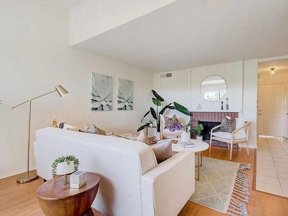 Light filled townhouse located in the verdant and peaceful community. The spacious two story townhouse is well designed with an efficient and intuitive floor plan. Wood flooring, fireplace, private patio. All bedrooms are located upstairs with the primary bedroom and secondary bedrooms located at opposite sides of the home. The primary bedroom features ample closets including walk-in closet, en suite bathroom, vaulted ceilings and views of rolling hills. Two-car garage has direct unit access. The townhouse is positioned at the periphery of the community which allows for all-round privacy and views. A short pathway through a bucolic parklike setting with mature trees leads to a community pool and spa! A great oasis near so many amenities! Owner pays for water. No smoking allowed.
