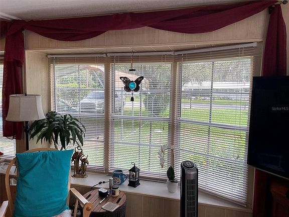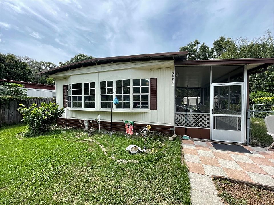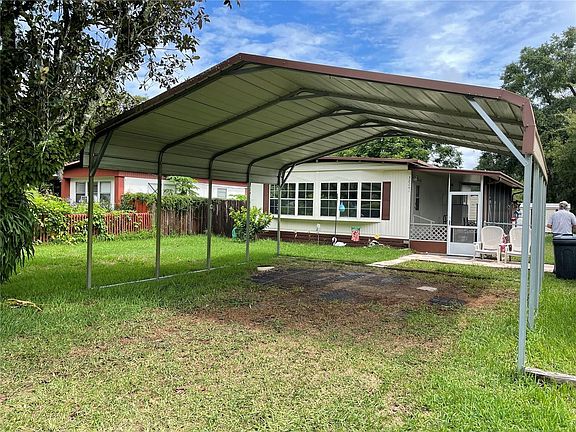 Must See, this attractive "Move-in-Ready' mostly furnished 2 Bdr. 1-1/2 Bath Doublewide with complete double rook, bay windows across the front of the home and under skirting all around for a neat & clean appearance. Interior features include a spacious, carpeted Living Room with ceiling fan, and window treatments at all the windows. The large bay windows allow for good natural light into the home and additional shelf space for your favorite collectables. In the Living Room is a second exit door which leads out to a raised open porch. Large Kitchen/Dining area (eat in kitchen) has a separate room divider pantry, faux wood cabinets and dbl. ceramic sink. Kitchen appliances include stove & oven, microwave and refrigerator/freezer. This home is very cozy. The bedrooms have ceiling fans with lights and good closet space. The attached screened Florida Room which extends nearly the lenght of the Dbl-wide has 2 screen doors, one on each end of the room and an open porch off the backside of the Florida Room. This porch area is ideal for grilling. There is a detached 2 car Carport situated in front with a high pitched roof which can accommodate high vehicles. There are 2 sheds with 3 storage areas, one shed has a concrete slab floor and contains the Laundry washer & dryer. Another shed has built-in workbench & shelves. The rear yard and on the east side is enclosed with chain-link fence. The property has a septic system and its own private well therefore, No city water bills, there's No HOA fees and No Deed Restrictions. The property is located minutes to Hwy 301 near the junction of Hwy 39 and easy access to Wesley Chapel via the new SR 56 for work, PHCC or Wiregrass Mall and other shopping.