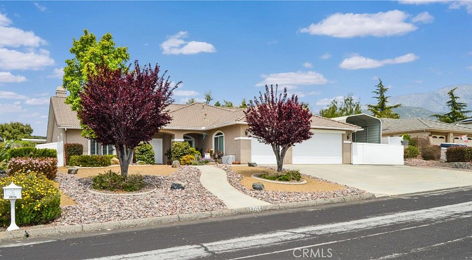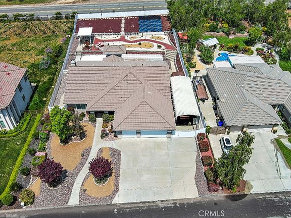 CHECK OUT the Recent Upgrades at 38256 Wild Poppy Lane at Yucaipa's Gateway to Oak Glen! Fantastic, Custom-Built, One Owner, Single-Story, Energy-Efficient Home with OWNED SOLAR! Electric is about $500/year - wow! BRAND NEW Waterproof Laminate Flooring in the Main Suite Bath and Pet-Friendly Artificial Grass & Fruit Cocktail Trees in the Backyard! Follow the graceful front walkway to the covered front porch, then enter through the double-doors to find a fabulous game room (or use it as a classic living/dining room) with louvered shutters on your left & an entry to the 4th bedroom/office on the right. Beyond the gracious entry hall, the open concept kitchen/family room awaits. The custom kitchen boasts abundant counter/cabinet space with some pull-outs, a breakfast bar, stylish black appliances, a walk-in pantry, a large breakfast nook & a handy pass-through window - perfect when BBQing in the outdoor kitchen. A cozy wood-burning fireplace with gas starter & raised hearth warms you on those chilly winter nights. The spacious main bedroom suite offers direct access to the covered patio & an en suite bath which features new flooring, dual sinks, vanity area, jetted tub, separate shower, private water closet, & a large walk-in closet. The bedroom next door has special sound-proofing features so is perfect for musicians, gamers, or those who just enjoy a quiet space. It connects to a Jack & Jill bath with another bedroom on the other side. The 4th bedroom (an office now) would be an amazing guest suite due to the attached bath & walk-in closet. A built-in desk in the hallway provides dedicated office/homework space. The indoor laundry offers abundant cabinet space & a handy sink. The easy-care, drought tolerant yard makes entertaining a true delight with artificial grass, a covered BBQ/kitchen (with a sink, two burners, a high-end BBQ & stainless steel cabinetry), a covered dining patio, another patio for lounging, a separate covered patio on the middle level (with 50 amp spa hookup), a gated dog run, & rock scape! The insulated garage with pull-down attic ladder & shed (with electricity) offer more storage. There's a huge 38'x14' RV carport on a concrete slab w/hook-ups (30 amp electric plus water/sewer) perfect for RV/toys/cars/projects! Additional features/upgrades: 27 OWNED solar panels (electric bill averages $400/year), central vacuum system, whole house fan, speakers, alarm system, ceiling fans, boxed-in eaves & more. You deserve this! Make it YOURS!