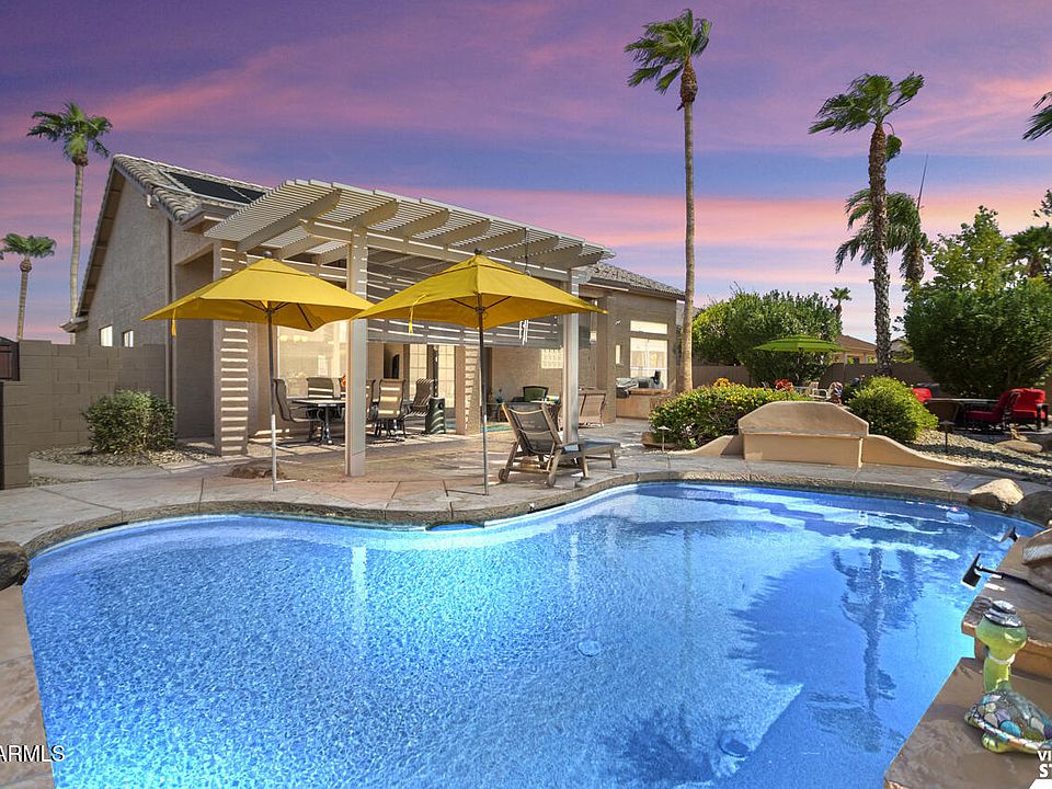Located on a PRIVATE corner lot offering an ''OASIS setting'' backyard with large inviting pool(replaced variable speed pump 2019 , pool cleaner and vacuum replaced 4/22 , filters replaced 5/25) and solar heated! Updated LED lighting outside, irrigation system and covered patio with shade blind. Pavers, additional gravel and flood light added in 2021! Kitchen is a ''Chef's delight'' with an abundance of updated cabinets by New Age (2017) to include a beautiful pantry in informal dining area, cabinet lighting (upper/lower). NEW 8/25 Fridgidaire fridge, wall oven and dishwaher!!! Electric cooktop range. Open to informal dining and great room with vaulted ceilings. Great views and easy access to outdoor living area. Fun home for entertaining with additonal flexible area in front of home and open to the den. Primary bedroom is very spacious offering room to easily accommodate larger furniture and sitting area, access to the outdoor living area,