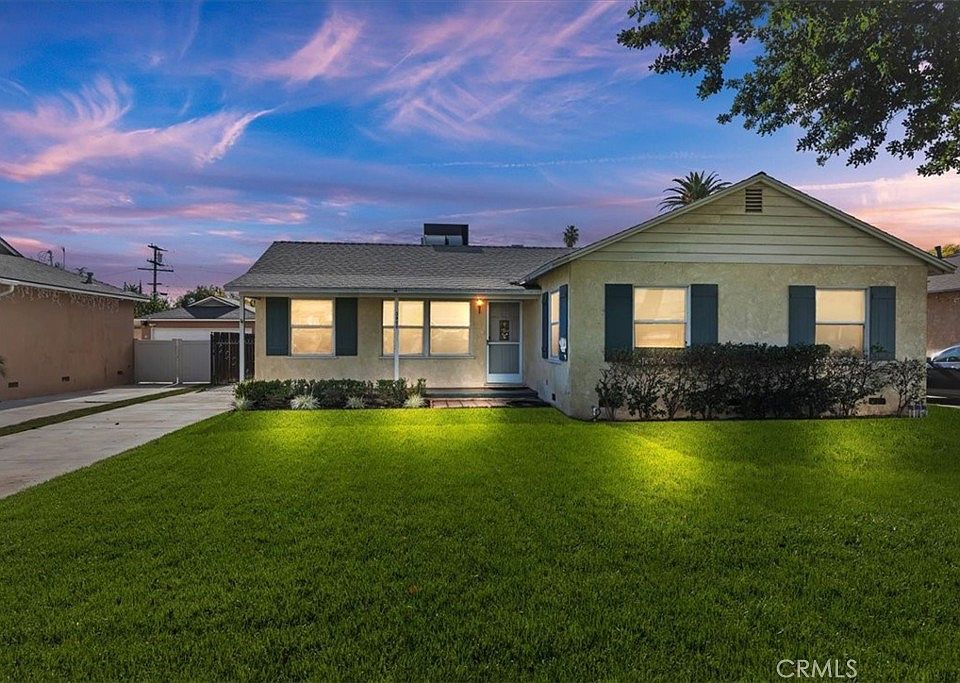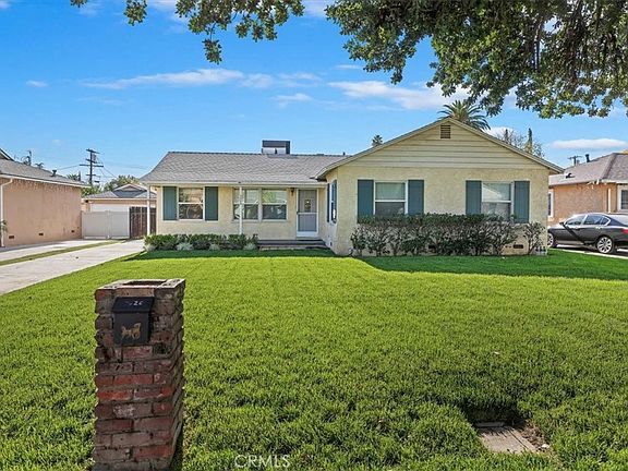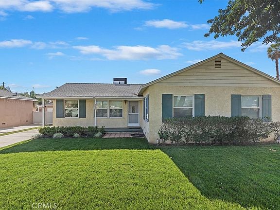 This charming single-level home features 4 bedrooms and 2 updated bathrooms on an expansive lot, offering both comfort and exciting potential. The spacious family room with a cozy fireplace flows into a bright kitchen complete with a welcoming breakfast nook. Additional conveniences include an inside laundry area and double-pane windows for improved efficiency. The home sits on a large lot, offering a covered patio perfect for outdoor dining, mature fruit trees, and plenty of room for possibilities such as a pool or an ADU. Fresh new sod enhances the curb appeal of the front yard. A long gated driveway leads to a 2-car garage set behind the gate, providing ample parking and added privacy. Close to schools and freeway access, this home blends convenience, charm, and opportunity.