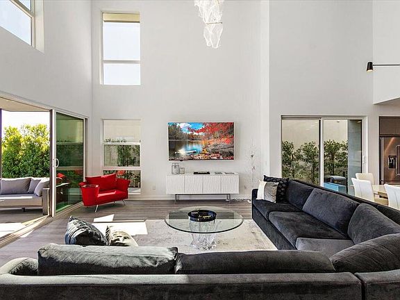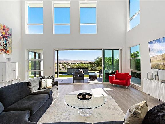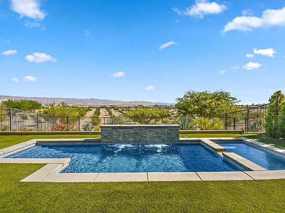 Come for the Views, and stay for the House! Panoramic Mountain Views from Great Room, Pool Side, Loft and All Bedrooms. This sophisticated Contemporary styled home has 3 En Suite Bedrooms plus a powder room. Backyard has an enlarged salt water, pebble tech pool & spa with waterfalls, covered patio, colorful landscaping, views of community Olive Groves and Mountains. Spacious Open Concept Great Room with cathedral ceilings and wall of windows that lets you be one with nature. Sleek, modern Kitchen has quartz counters, stainless-steel appliances, walk-in pantry, and breakfast bar. 1st Floor Owner's Suite has sweeping backyard views, spacious walk-in closet, and elegant bathroom with huge shower. Additional 1st floor guest suite. Upstairs Loft has breathtaking Panoramic Views of Mt. San Jacinto, plus a 3rd guest suite with balcony and views of the Little San Bernadino Mtns. Garage is wired for 2 vehicle charging units. The Solar Electric System is owned, and the house has other smart home technology too. (HOA allows rentals as short as 7 days.)