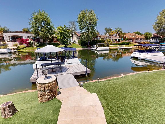 Discover Southshore Westlake Village! Entertainers dream home! Unparalleled elegance in this stunning Tuscany-style home, boasting exceptional curb appeal with beautiful stone exterior and a custom stamped colored driveway matching the Versailles travertine entry. Meticulously landscaped grounds feature custom lighting and an automatic sprinkler system, complementing a brand-new, ultra-quiet two-car garage door, and wrought iron-adorned steel double entry doors. Step inside to breathtaking lake views, a stone-accented family room with soaring sandblasted natural wood beamed ceilings, and engineered maple hardwood floors throughout. The remodeled kitchen dazzles with white soft-close cabinetry, granite counter tops, KitchenAid and Viking appliances, and artisan oil-rubbed bronze tin tiled ceilings. Upstairs, the primary suite offers a Juliet balcony with lake views, a luxurious en-suite bath, and custom closet organizers, alongside three additional bedrooms and a full bath with dual vanity. Entertain effortlessly on the rebuilt composite dock with lights and Versailles travertine patio, complete with a new Alumawood patio cover, ceiling fans, and a large bar area, all framed by wrought iron railings and lush privacy landscaping. Modern conveniences include Feit electric smart lighting, a whole-house fan, owned solar system for near-zero electricity bills, dual water softeners, Nest-controlled A/C units, and a barrel tile roof. Freshly painted with high-end finishes, this lakefront masterpiece blends timeless luxury with cutting-edge efficiency. This home exudes pride in ownership! Nestled in Westlake Village on Cul-de-Sac street, residents enjoy access to a serene 125-acre Westlake Lake for kayaking, paddleboarding, and fishing, the scenic Westlake Golf Course, and extensive hiking and biking trails in the nearby Santa Monica Mountains National Recreation Area. The vibrant Promenade at Westlake offers upscale shopping and dining, while community events like the Fourth of July fireworks and Holiday Boat Parade foster a tight-knit, luxurious lifestyle.