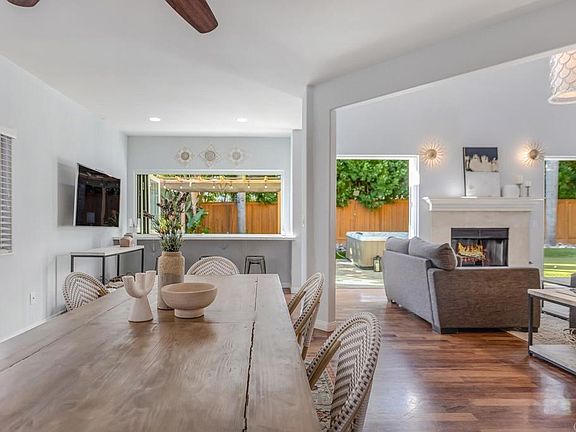 Located in the highly desired west side of Rancho Santa Fe and a short walk or golf cart ride to the Morgan Run Club & Resort, with golf, tennis, pickleball, swim, fitness, dining, and recently acquired with plans for $25M+ in improvements. HOA fees of only $100/year in security monitored Whispering Palms neighborhood, serenely surrounded by golf course. Home features 5 bedrooms AND an office + 4.5 baths. Downstairs large ensuite bedroom with private entrance offers multigenerational/tenant possibilities. Downstairs office opens thru French doors to a private front courtyard. Upstairs, primary bedroom offers travertine-tiled fireplace and large walk-in closet. Also up, 3 generous-sized 10ft ceiling secondary bedrooms, each with walk-in closets, one ensuite with private sun deck. Kitchen/family room opened and remodeled with focus on family and social gatherings, including a folding pass-through window to the backyard with indoor/outdoor counter seating. Two sets of French doors featured in the high-ceilinged great room deliver you to your private oasis of a backyard with spa(conveys) and a top-of-the-line putting/chipping green. Other highlights include hardwood flooring, Plantation shutters, new carpet, marble counters, herringbone marble backsplashes, 6-burner Viking range, double oven, wine fridge, recent paint refresh, solar. Simplify your life with efficient freeway and coastal access, walkable club access, and evening strolls surrounded by hot air balloons.