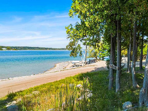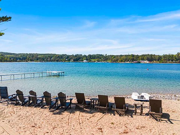 Imagine ending each day with breathtaking sunsets over Lake Charlevoix from this iconic 5-bedroom, 2-bath log home, offering 150 feet of private frontage and more than 3 acres of pristine land on the sought-after Hemingway Peninsula. Originally built as a 1930s log cabin, this home was seamlessly expanded with a modern addition, blending rustic Up North charm with today’s comfort and convenience. Inside, a thoughtfully designed kitchen makes preparing meals for family and friends a joy, while the vaulted living area, anchored by a classic fieldstone fireplace, frames expansive lake views through walls of glass and multiple doorwalls. The primary ensuite continues the timeless log motif with rich wood and stone details, creating a true Northern Michigan retreat. Outdoor living is just as magical. Entertain on the back patio or dine alfresco on the waterside deck. Down by the shoreline, build sandcastles on the beach or launch cannonballs off the dock into the sparkling blue waters. As the sun sets, gather around the lakeside firepit for stories and s’mores under the stars. With over 3 acres and 150 feet of frontage, the property offers future flexibility, including potential for a land split. Offered fully furnished, this turnkey escape even includes a 2017 Bennington Tritoon. As a proven income producer, the property generated nearly $100K in rental revenue for the 2025 summer season. Seller is also open to discussing land contract terms, providing additional opportunities for ownership. Opportunities like this in Northern Michigan’s “Golden Triangle”, where natural beauty, outdoor adventure, and timeless lakefront living meet, are truly rare. Pack your bags and step into the Lake Charlevoix lifestyle you’ve been dreaming of.