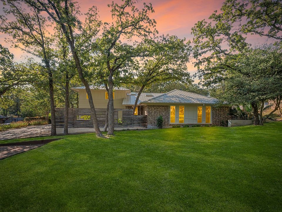 Fully remodeled a few years ago and move-in ready! Modern, Light-Filled Home on a Wooded .47 Acre Lot in Grapevine! This stunning contemporary residence blends sleek design with natural beauty, set on a serene lot in sought-after Grapevine. Originally remodeled and expanded in 2016 by the renowned architect-design team at FIRM817, every detail has been thoughtfully crafted for style, comfort, and functionality. Step inside to find clean lines, expansive windows, and solid oak hardwood floors throughout the main living areas and first-floor primary suite. The gourmet kitchen boasts quartz countertops, stainless steel appliances, an induction range, abundant cabinetry, and an oversized walk in pantry. The first-floor primary suite offers a peaceful retreat with a spa-inspired bathroom featuring a double shower, freestanding insulated tub, and a large skylight for natural illumination. Upstairs, a second suite functions as a mini apartment with its own kitchenette, tucked among the treetops. Nearby, a third bedroom includes its own bathroom and a hidden loft with skylight, perfect for a cozy reading nook or creative space. A spacious media room completes the upstairs layout. Downstairs, the home also includes a versatile mudroom, large laundry room with built-in desk, a fourth full bathroom with shower, and access to a 2 car garage plus a separate workshop storage area. This energy-efficient, all electric home features two heat pumps, spray foam insulation, and a durable metal roof. Unwind in the screened-in back porch surrounded by nature, or take a short walk or bike ride to scenic Parr Park. A truly one of a kind property in a fantastic location, don't miss this unique opportunity in the heart of Grapevine!