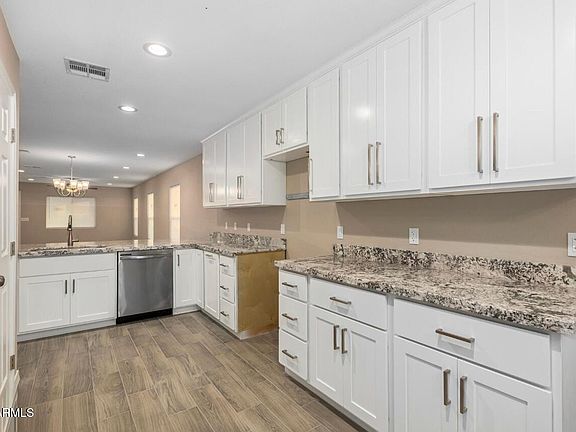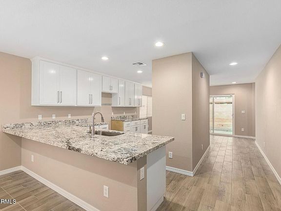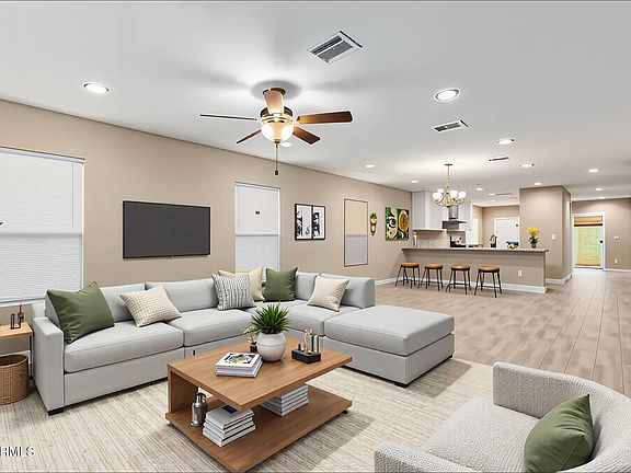 Well-maintained single-level home with 2-car garage, RV gate, and low-maintenance yard. Features wood-look tile, recessed lighting, and open great room. Kitchen offers white cabinets, granite counters, pantry, and breakfast bar. Spacious primary suite with dual sinks and walk-in closet. Covered patio and large backyard with room to customize.