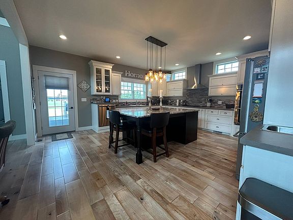 This stunning property offers 2,560 sq ft above grade, plus an additional 1,332 sq ft of finished living space in the basement, and includes an attached 3-stall garage-all situated on 2 acres less than 2 miles from Redfield. Step through the front door into the impressive great room with soaring two-story ceilings, an electric fireplace on a wood accent wall, a dining area, and a cozy sitting space. The open layout flows seamlessly into the dream kitchen, featuring soft-close cabinetry, granite island with seating, two built-in ovens, a large pantry, and access to a composite patio perfect for entertaining. The main level also offers a spacious laundry room, a full bath, a comfortable bedroom, and a versatile multipurpose room conveniently located off the garage entry. Upstairs, the private primary suite boasts a large walk-in closet and an en suite with heated floors. The finished basement expands your living space with a generous second living area, two additional bedrooms with walk-in closets, and another full bath. A stairway connects directly to the garage for added convenience. The attached garage includes two insulated and heated stalls, while the exterior features mature trees and established landscaping, providing a peaceful setting to enjoy.