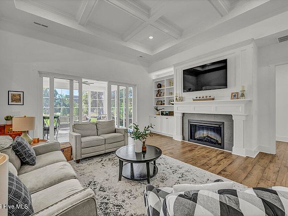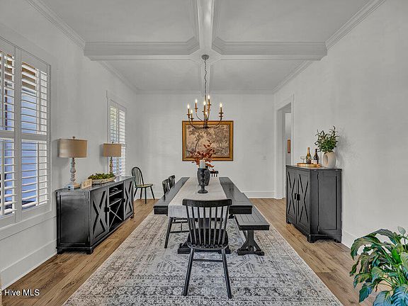 Step inside to discover 12-foot ceilings, coffered ceilings in both the living and dining rooms, and a bright open layout that connects seamlessly to the outdoors. Throughout the home, you'll find upgraded LVP flooring that provides the perfect blend of style and durability that adds warmth, comfort, and easy maintenance to every living space. The living room features custom built-ins and an electric fireplace, while the chef's kitchen showcases quartz countertops, soft-close cabinetry and drawers, two pantries, and an upgraded 48-inch gas range - perfect for entertaining or everyday cooking. The primary suite is conveniently located on the first floor and offers a peaceful retreat with a soaking tub, walk-in shower, and a spacious walk-in closet.
