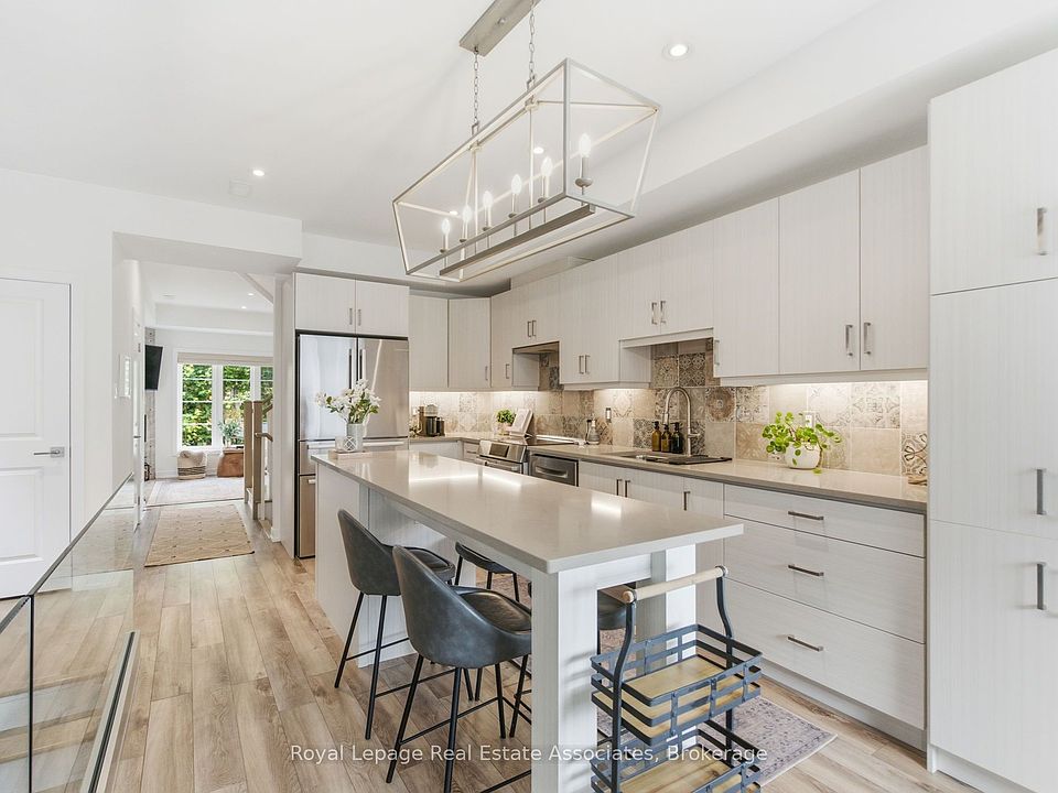 This beautiful 3 Storey End Unit All Brick townhome boasts high end finishings throughout the property, and a spacious backyard. Immediately upon entering this home you will note that there are thoughtful upgrades and touches throughout. Unique to this specific property the front entrance has been opened up to include a glass partition wall in the kitchen area allowing ample natural light and an open concept feel. The main floor of this home offers an excellent space well suited for all types of buyers, especially those that enjoy entertaining or a free flowing space. The large kitchen has been completed with high end finishes with bosch appliances, large island with seating for 4, tasteful backsplash, and walk out to your balcony. The living room area overlooks the backyard and includes a wood feature wall, electric fireplace, pot lights and a large window overlooking the backyard. The main floor also includes a tasteful 2 piece powder room, and is functional for all of your families needs. The upper level of this home features 2 large bedrooms. The primary retreat boasts a 3 piece en-suite and two "his and hers" closets, broadloom and a large balcony. The second bedroom has been set up almost like a secondary primary with a main 4 piece bath adjacent to the bedroom which boasts a spacious closet, broadloom and large window overlooking the backyard. The lower level of this home features an optional third bedroom / den area with immediate back yard access (separate entrance), and an additional 4 piece bathroom. This level also features inside garage access. The basement level of this home includes an additional rec room with broadloom and a feature fireplace, laundry area and ample storage. The big bonus of this home is the spacious back yard which has been beautifully updated with new landscaping and fencing. If you're looking for something completely move-in ready that is equipped with high end finishings throughout this is the home you've been waiting for!
