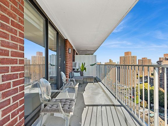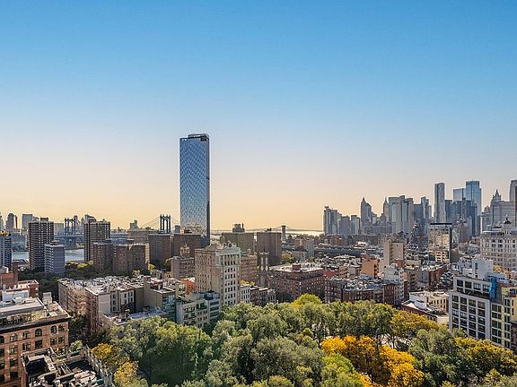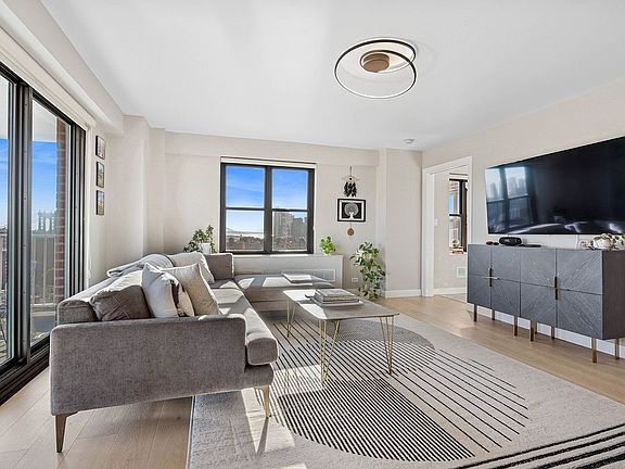 This fully renovated top floor home features an expansive great room opening to a 125 square foot private terrace with dramatic views to the downtown skyline, East River and beyond! Two walls of outward facing windows serve up southeastern and southwestern exposures for excellent light and air throughout. Daytime views, sunsets and nighttime views are equally breathtaking! Enter via a welcoming foyer (with large coat/storage closet) and be ushered into the modern open concept plan. The windowed kitchen comes complete with an abundance of warm wood cabinetry in maple, a custom dining bar, striking Zodiaq quartz countertops, and a suite of stainless appliances (Frigidaire double door refrigerator with built in water and ice dispenser, LG dishwasher, Kitchen Aid slide in gas range, and LG ThinQ microwave hood). Just beyond is a spacious living/dining with double exposures and open views for gracious entertaining or repose. The primary bedroom with en suite bath includes a huge walk-in closet with your own Miele washer & dryer! The primary bath is done in crisp white subway tile complemented by a striking marble Herringbone mosaic floor and includes a deep soaking tub, rain stytle shower with separate hand held, and a stylish double door vanity. A special bonus room, unique to this design, serves nicely as a separate home office, nursery, or work out space (its current use). Wide plank white oak floors unite the space throughout further accentuating the light and airy feel of this penthouse style home.