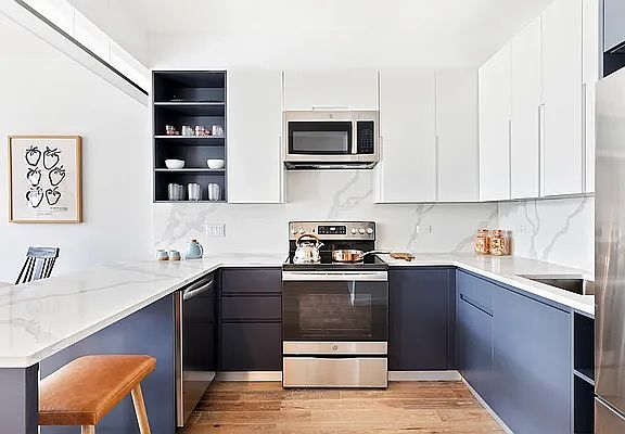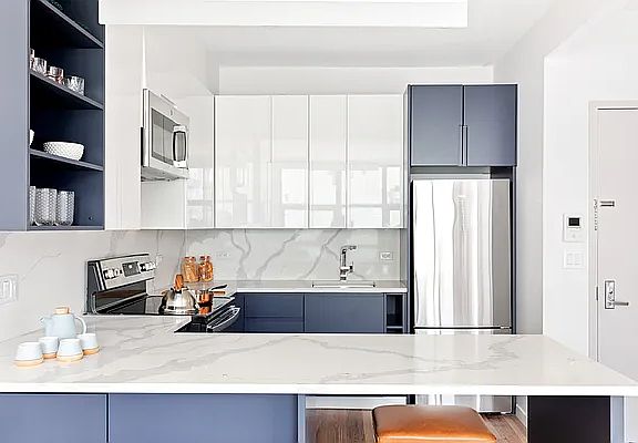 Residence 2A is a sun-filled, western facing one- bedroom with oversized floor- to-ceiling windows. The ultra-modern kitchen encompasses a tasteful combination of white lacquer and matte navy cabinetry that flows seamlessly with white quartz countertops and backsplash, a stainless-steel LG appliance package features a four-burner cooktop, microwave and full-size dishwasher as well a custom range hood for lots of cooking. Additional features include an LG W/D, an eat-in breakfast bar adjacent to the living area, and shared roof access.