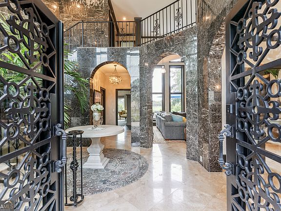 High-stated fireplaceSoaring ceilingsMain-level primary suiteJuliet balconyOversized islandStunning stone surfacesElegant wrought iron staircase