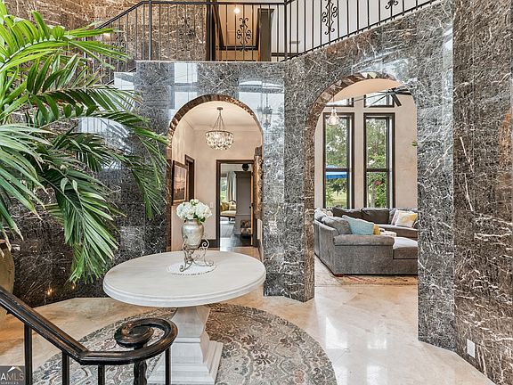 This stunning residence blends timeless European elegance with modern luxury, offering an exceptional lifestyle within the private, gated community of Oak Grove Island. From the moment you approach, the home's wrought iron double doors and solid concrete construction set the tone for quality and sophistication. Step inside the grand marble-clad foyer, where soaring ceilings, arched openings, and an elegant wrought iron staircase create an immediate sense of scale and refinement. Expansive floor-to-ceiling windows flood the home with natural light, accentuating the travertine and hardwood flooring throughout. The impressive living room features a high-stated fireplace framed by tall windows, offering both warmth and grandeur. Flowing seamlessly from the living room, the newly renovated gourmet kitchen is the heart of the home-designed for both entertaining and everyday comfort. It showcases an oversized island with stunning stone surfaces, abundant custom cabinetry, and two hammered copper sinks, complemented by a third copper sink in the adjoining bar area. A large walk-in pantry provides built-in shelving and cabinetry ideal for appliance and dry-goods storage. The kitchen opens to a breakfast area and a cozy den with sliders leading to the back patio-perfect for enjoying tranquil views of the golf course and the lake's fountain. The main-level primary suite offers a private retreat with direct access to the patio and hot tub. Its spa-like bath features a separate steam shower, a porcelain-lined oversized shower, a soaking tub, dual vanities with granite countertops, and spacious his-and-hers walk-in closets. A second primary suite on the upper level provides flexibility for guests or multigenerational living, featuring a Juliet balcony that overlooks the picturesque grounds. All bedrooms in this home are ensuite, each designed with its own private entry hall for optimal comfort and privacy. The upper level also includes a large bonus room plumbed for a future bath, a well-appointed office located mid-level between the floors, and a spacious gym positioned over the garage with its own staircase leading to the laundry area. The upper hall opens dramatically to the foyer and living room below, emphasizing the home's open, airy design. Every inch of this residence has been thoughtfully renovated, combining quality craftsmanship with fine materials throughout. The solid concrete construction ensures long-lasting durability, and the sunset views across the golf course and lake provide a daily reminder of the serene setting that defines life on Oak Grove Island. This home is truly one of a kind-an elegant blend of European inspiration, luxury finishes, and enduring strength.