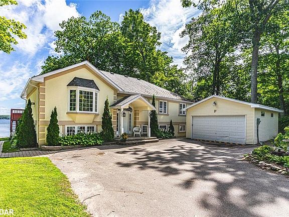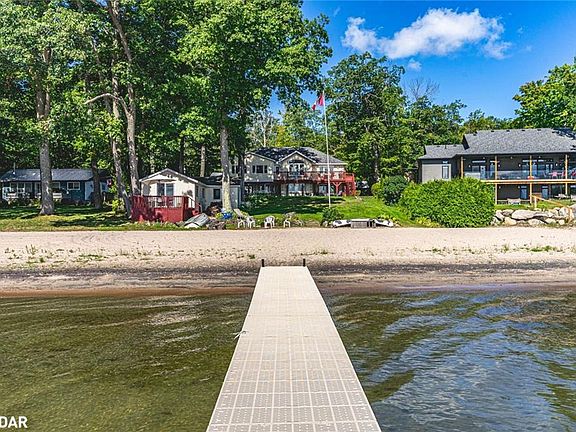 LUXURIOUS GEORGIAN BAY ESTATE WITH 83 FT OF SANDY SHORELINE, SECOND COTTAGE, DETACHED GARAGE & ALMOST HALF AN ACRE! 83 feet of Georgian Bay frontage with eastern exposure presents a private sandy beach with gradual entry, clear waters, and sunrise views that define the waterfront lifestyle. Set on nearly half an acre with a large back deck, the property is further enhanced by an expansive L-shaped dock with a bump-out that extends into the bay, offering an impressive setting for entertaining, lounging, and docking motorcraft. Located on a coveted cul-de-sac along sought-after Peek-A-Boo Trail and just steps from Tee Pee Point Park, the property delivers exclusivity and tranquillity while remaining approximately 10 minutes to local essentials and a short drive to Penetanguishene and Midland for expanded amenities. The primary residence introduces itself with a stately front entry, covered porch, manicured landscaping, and a detached two-car garage with six-car driveway parking. The kitchen is appointed with rich wood cabinetry topped with crown, granite counters, stainless steel appliances, and a built-in desk area. The living room features a bay window, crown moulding, fireplace, and French doors, while the spectacular sunroom boasts soaring ceilings, shiplap accents, pot lights, a dramatic fireplace, and a walkout. The primary bedroom highlights its own walkout to the sunroom, a walk-in closet, and a spa-like 6-piece ensuite. Extending the living space, the finished walkout basement showcases a massive rec room with a third fireplace, pot lights, and room for a pool table, along with a fourth bedroom and full bath, with the entire level opening directly to the yard and waterfront. A versatile second cottage with two bedrooms, a bathroom, a kitchen and a living area, and a private deck enhances the property’s functionality for family and guests, while main floor laundry, in-floor radiant heating, central vac, and ERV/HRV systems add to the overall comfort.