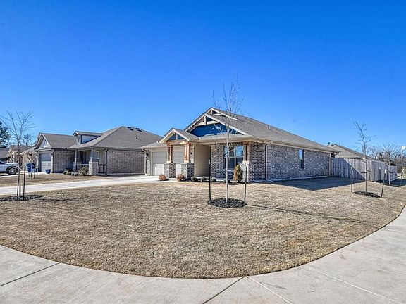 Situated on a corner lot, this home with a craftsman elevation is a small package loaded with big upgrades, such as quartz counters, stainless steel appliances, uniquely tiled backsplash, and gas range in the kitchen. You'll love the split floor plan with open concept living/dining space, plenty of natural lighting, wood like tile flooring and window blinds installed throughout. Enjoy the large walk-in closet in the primary bedroom as well. The Woodlands is located at Dobbs and Reno in the Harrah school district, just a few miles from downtown Harrah and just a few minutes from the new Kickapoo Turnpike. Owner is licensed.