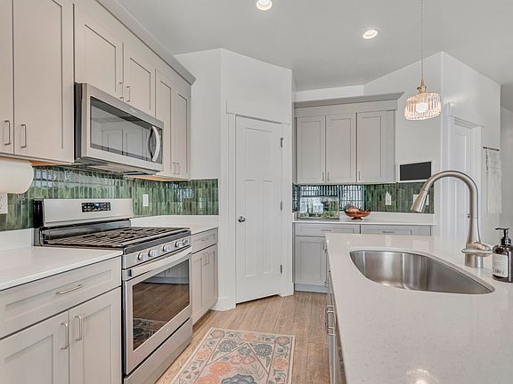 Stylish lightingSpacious islandStainless steel appliancesLarge windowsSoaring ceilingsVaulted ceilingNatural light