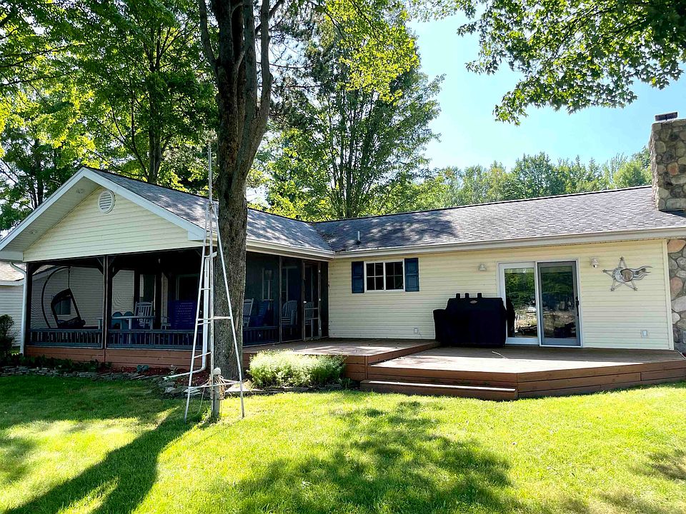 Wonderful 2-bedroom 2-bath Ranch on All Sports Secord Lake. Enjoy the view of sparkling water from the screened-in porch, the open deck, and the waterfront deck. Large treed lot with a seating area around the fire pit, wood seawall, and wood walkways around the water's edge. Country-style home with an open floor plan. Plenty of oak cabinetry in the U-shaped kitchen with peninsula seating for casual meals. The family-size dining area opens to the living room with a natural wood fireplace and a patio door to the screened porch. Enjoy relaxing and mosquito-free dining on this lovely porch with a vaulted knotty pine ceiling and stone wall, used for 3 seasons with outdoor heaters. The primary bedroom is spacious with room for extra beds. The main full bath sits between the bedrooms, with a secondary bath with shower shared with the laundry area. Extra space comes in handy with the additional family room off the kitchen with large windows, a spacious seating area, and a patio door out to the deck. The quaint brick fireplace keeps the room cozy on those chilly evenings. Utilize the attached garage for parking or storage and an additional garage with an updated guest house. Lake levels are currently lowered for dam construction/updates, but there's plenty of water for swimming, fishing, and kayaking. Pontoon boats are cruising the main lake and channels, and full lake levels are expected to return in the summer of 2026. See the FLTF website for all information regarding the dam construction, assessments, and the full lake-level timeline. www.four-lakes-taskforce-mi.com. Secord Lake is a wonderful recreational area surrounded by state land for hiking, ORV trails, hunting, and snowmobiling. Don't miss out on this one! Just 2.5 hours from the Detroit suburbs.