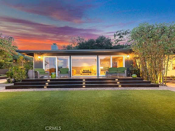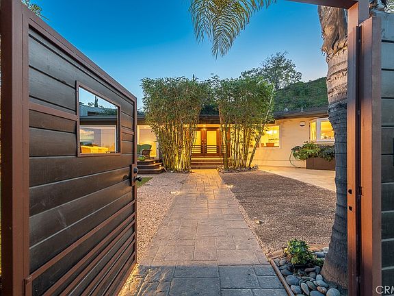 Nestled in the hills of Sherman Oaks and set back from the street up a long driveway behind gates and privacy hedges, this updated single level mid-century styled pool home awaits its new owners. A private courtyard with a large grassy area and a spectacular wood deck lead to double etched glass doors flanked by bamboo trees for a grand entrance. Gleaming wood floors and recessed lights greet as you pass the formal entry to the living room that features a beautiful stone fireplace, walls of glass and 2 sets of sliders flooding the interior with natural light and showcasing the views of the mountains beyond. A chef’s dream kitchen is highlighted by an over-sized stone island with seating and storage, white custom cabinetry, glass tiled backsplash, a walk-in pantry and a large picture window overlooking the courtyard and serene mountain views complimenting the large formal dining room that looks out to greenery. The family room includes sliding doors to a covered stone patio for indoor/outdoor entertaining. The splendid primary suite features a lovely sitting area with French glass doors that lead to a private romantic patio containing beautiful foliage. There is an oversized pro-organized center island walk-in closet and a resort-styled bath with designer stone flooring, dual sinks, a two-person steam shower with seating and multiple faucets, a separate jetted tub, and a frosted glass door encloses the water closet for the utmost privacy. Spacious secondary bedrooms share a full bath with dual sinks, glass tiled backsplash and designer stonework. Off the family room, an ensuite bedroom with full bath, a laundry room with subway glass-tiled backsplash and an enormous bonus room perfect for a home theater, game room, or a large office includes access to the rear. A sparkling free-formed salt-water pool, a large covered patio with lighting, pergola, multiple conversation areas, and a built-in Viking BBQ, are just some of the highlights of this fabulous property that is waiting for its new owners to call home. Additional amenities include a designer powder room, solar panels, water filtration, security and surveillance systems, and a prime location just minutes to the westside or Ventura Blvd. Luxury living at its finest!