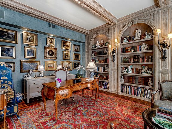 Making your way upstairs, you have the option of utilizing the classic stairway with brass handrails and a designer runner or the private elevator within the home. Once upstairs you step into the primary bedroom with floor to ceiling windows, pickled wood paneling, marble fireplace and designer wallpaper. Two primary baths and closets provide much desired space for the homeowners.