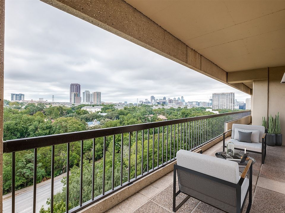 Fall in love with spectacular views of Downtown and Turtle Creek in this special corner unit at the prestigious Warrington. A large terrace spans the length of the unit with a BONUS breakfast terrace off the kitchen. The generous living and dining spaces allow optimal configurations for entertainment. The primary bedroom with a desk area and shelving, is also large enough for seating. 3 closets compliment the primary suite. This unit is priced to allow a Buyer to take the blank canvas and create their private, special environment. The Warrington employs an amazing staff to take care of your needs. Enjoy tennis and pickleball, swimming, a fitness center, lounge and business areas. 24 hour security is a plus. In addition to enjoying the beauty of Turtle Creek, this location is close to fine dining, shopping, Highland Park, Uptown and The Katy Trail. 2 assigned adjacent parking spots, one with outlet for hybrid vehicle and a large storage unit.