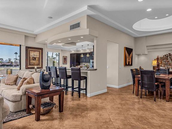 Resort style living every day in your elegant oasis home with private elevated views of the golf course and lake, adjacent pool, lush country club grounds with mountain backdrops, lagoons, and incredible scenery at every turn. This is your opportunity to enjoy a lock and leave lifestyle seasonally or all year round. This home has been lavishly updated throughout including an opening up of the gourmet kitchen to the great room. An ample breakfast counter with wet bar, kitchen island, and chef's dream appliances fulfill your culinary delights. Dine at the island counter, the dining nook with sunrise views, or the formal dining room that features a spectacular skylight. The hallmark stackstone fireplace anchors the comfortable great room, and a three panel sliding door brings the outdoors in which is a coveted part of the desert lifestyle. All bedrooms are en suite, and there is a powder room for guests. The spacious primary bedroom with vaulted ceiling is all about comfort with an en suite bathroom including large walk-in custom closet, dual vanities, a make-up area, and incredible statement tile shower. A skylight brings soft natural light to the space. The inviting guest bedroom has a vaulted ceiling, with ensuite bathroom that includes dual vanities and a tile shower. The multi-purpose den/bedroom has a polished built-in work space, and large comfortable sectional and ottoman. The adjoining ensuite bathroom has tile shower and closet. The included turnkey furnishings are luxurious - all you need is your toothbrush and you'll be ready to enjoy! The attached garage is complete with sport floor, cabinets, two car garage plus the golf cart garage, mini-split. Explore the various private membership options for Palm Valley Country Club for golf, tennis, pickleball, fitness, social activities, restaurants and bar, and more. This club is packed with active people of all ages who love the central Palm Desert location close to attractions like El Paseo, Acrisure Arena, Coachella and Stagecoach festivals, PS Airport.