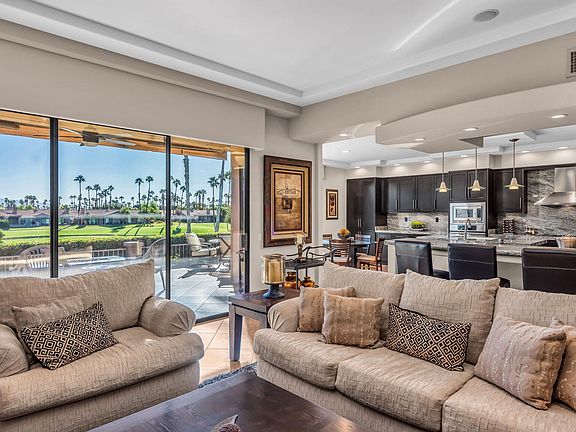 Resort style living every day in your elegant oasis home with private elevated views of the golf course and lake, adjacent pool, lush country club grounds with mountain backdrops, lagoons, and incredible scenery at every turn. This is your opportunity to enjoy a lock and leave lifestyle seasonally or all year round. This home has been lavishly updated throughout including an opening up of the gourmet kitchen to the great room. An ample breakfast counter with wet bar, kitchen island, and chef's dream appliances fulfill your culinary delights. Dine at the island counter, the dining nook with sunrise views, or the formal dining room that features a spectacular skylight. The hallmark stackstone fireplace anchors the comfortable great room, and a three panel sliding door brings the outdoors in which is a coveted part of the desert lifestyle. All bedrooms are en suite, and there is a powder room for guests. The spacious primary bedroom with vaulted ceiling is all about comfort with an en suite bathroom including large walk-in custom closet, dual vanities, a make-up area, and incredible statement tile shower. A skylight brings soft natural light to the space. The inviting guest bedroom has a vaulted ceiling, with ensuite bathroom that includes dual vanities and a tile shower. The multi-purpose den/bedroom has a polished built-in work space, and large comfortable sectional and ottoman. The adjoining ensuite bathroom has tile shower and closet. The included turnkey furnishings are luxurious - all you need is your toothbrush and you'll be ready to enjoy! The attached garage is complete with sport floor, cabinets, two car garage plus the golf cart garage, mini-split. Explore the various private membership options for Palm Valley Country Club for golf, tennis, pickleball, fitness, social activities, restaurants and bar, and more. This club is packed with active people of all ages who love the central Palm Desert location close to attractions like El Paseo, Acrisure Arena, Coachella and Stagecoach festivals, PS Airport.