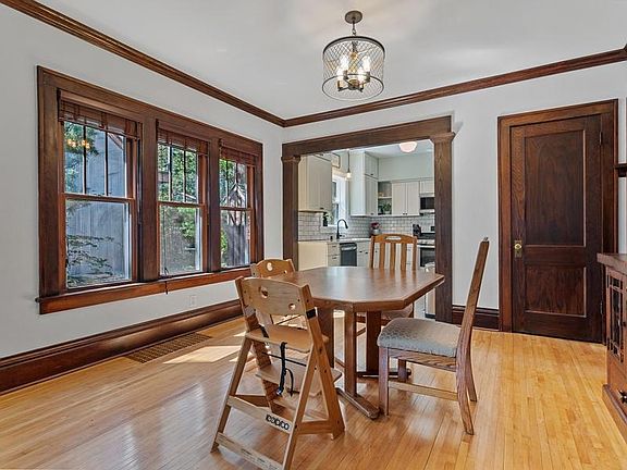 Main floor updates feature an elegant modern kitchen, on trend full bath, and spacious open floor plan but the highlight remains beautiful dark wood trim and built-in buffet.