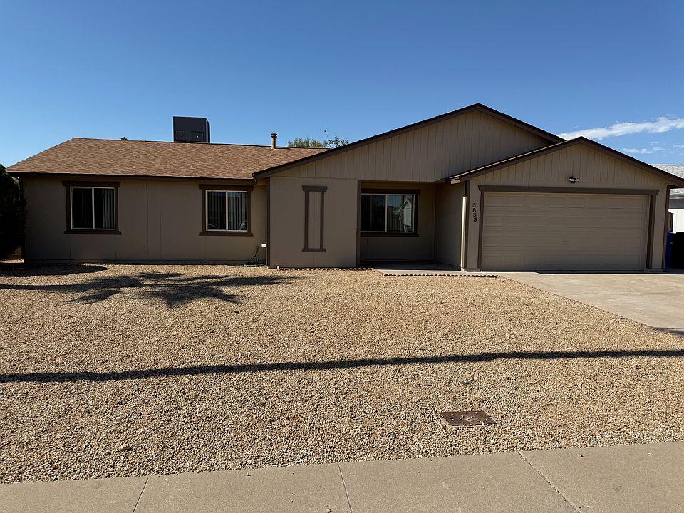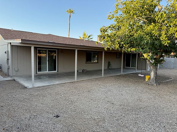 House is completely refreshed with new paint inside and outside and is available on July 1. New large diameter ceiling fans are in the kitchen and in the family room. Washer and dryer are included. New wood horizontal blinds for the windows and new verticals for the two sliding glass doors are on order and will be installed when they arrive in two weeks. There are two sliding glass doors, one in the master bedroom and one in the family room, and they both open to the very large covered patio in the fenced back yard. Family room, kitchen and hallways are tiled, with carpet in the living room and three bedrooms. The house is located in a quiet residential neighborhood near the 40th ST and Thunderbird intersection for close proximity to shopping with great access to major streets such as the SR51 and 101. Renter responsible for all metered utilities