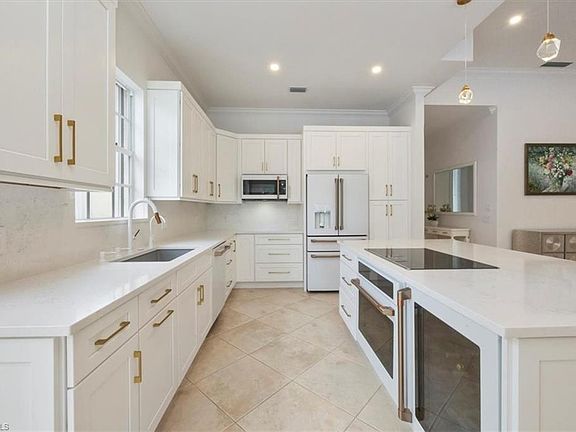 Sunset views and resort-style living in Village Walk in beautiful Naples, FL! Enjoy breathtaking sunsets every night from your own private, western-facing, solar-heated saltwater pool. This outstanding, reimagined Oakmont floor plan offers 3 bedrooms, a den/home office, 3 full baths, and a 2-car side-load garage with an epoxy floor and brick paver driveway. The stunning kitchen showcases custom cabinetry, quartz countertops, a freestanding island, and Café appliances - perfect for entertaining. The primary suite features generous closet space and a beautifully renovated bathrooms (2 primary bathrooms) highlighted by a striking tiled feature wall. Additional upgrades include 20-inch porcelain tile set on the diagonal, roof replaced in 2019, new AC in 2023, freshly painted exterior with the new hoa approved color pallet, crown molding, hurricane protection, and a custom built-in bar. The home’s private setting backs to a cul-de-sac with no direct neighbor behind and is surrounded by lush landscaping and charming potted plants. Located in an interior section of the community, this residence offers peace and privacy while being close to everything. Village Walk is one of North Naples’ most sought-after communities—just under 5 miles to Vanderbilt Beach and the shopping and dining at Mercato. Residents enjoy an active lifestyle with tennis, pickleball, a fitness center with lap pool, two resort pools, a restaurant, miles of scenic walking paths, and more!