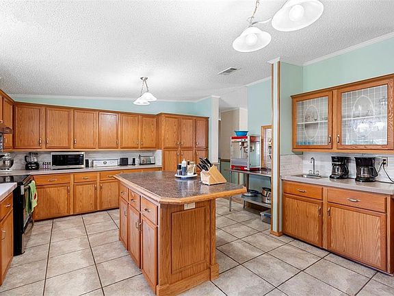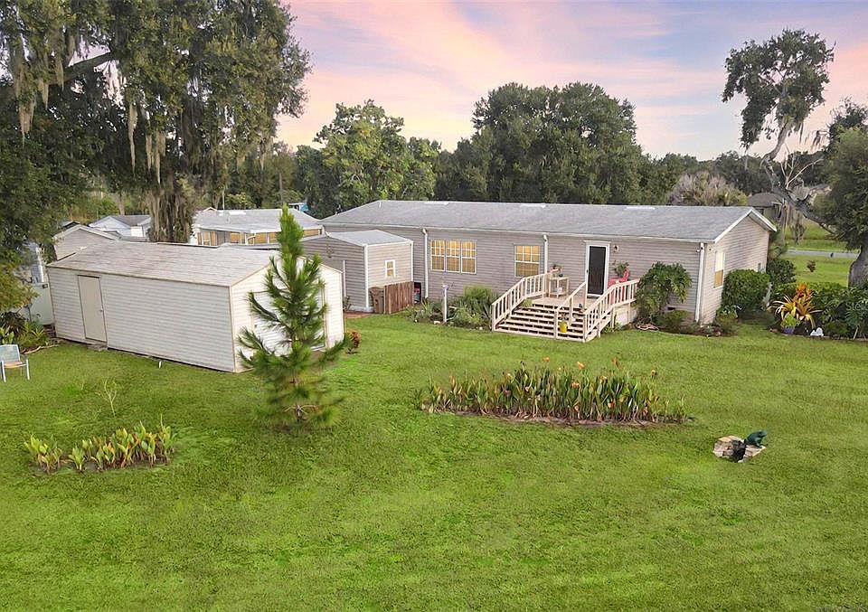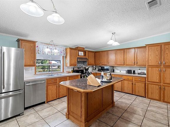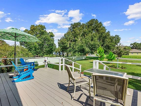 This beautifully landscaped and well updated 3/2 split floor plan home on over ½ acre corner lot in Kings Peninsula has been meticulously cared for. This gorgeous home includes 2,015 square feet and 2 bedrooms and 2 baths, but the bonus room could easily be converted back into a 3rd bedroom. The large kitchen is a chef’s dream and is truly the heart of this home, boasting volume ceilings, a huge central island, stainless steel appliances, breakfast bar, and more counterspace and storage than you can imagine. The spacious main living area is adjacent and open to the kitchen and flows to the 15’ X 15” primary bedroom suite, which boasts a massive walk-in closet and remodeled ensuite bath with dual vanities and a walk-in shower. The large second bedroom also includes a walk-in closet. Outside, the huge front or rear deck is the perfect place for an afternoon barbecue or just stargazing with a drink during the cool nights. Also included is the 14’ X 25’ outbuilding along with the smaller storage shed, exterior sink that is perfect for cleaning fish, and the front-loading Samsung washer and dryer. The roof was replaced in 2019, and the air conditioning system was new in 2024. This quiet community features an ultra-low of around $150/year, includes access to Lake Yale and is available to those of ALL ages. Ask your Realtor® for the unbranded virtual walking tour of this incredible home. All measurements are approximate and should be independently verified.