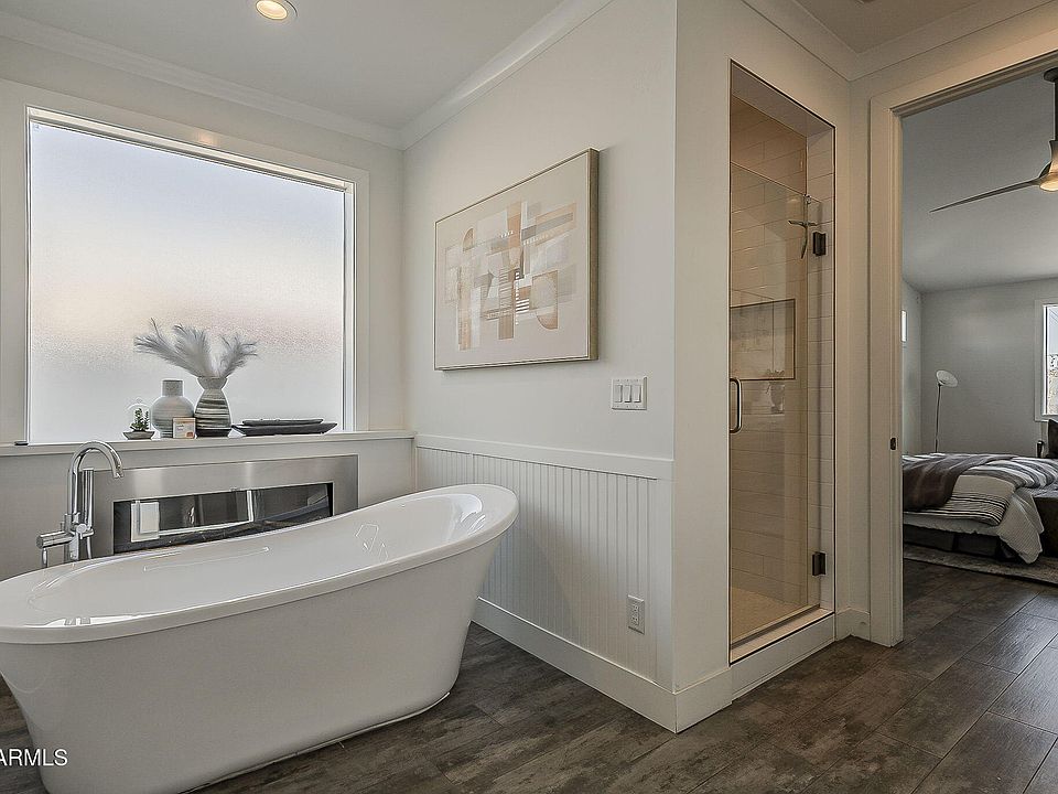 Each bedroom is generously sized, including a relaxing primary suite that offers a spa-like bathroom featuring a walk-in shower, luxurious bathtub with fireplace, LED lighted mirrors, dual sink vanity, and large walk-in closet.